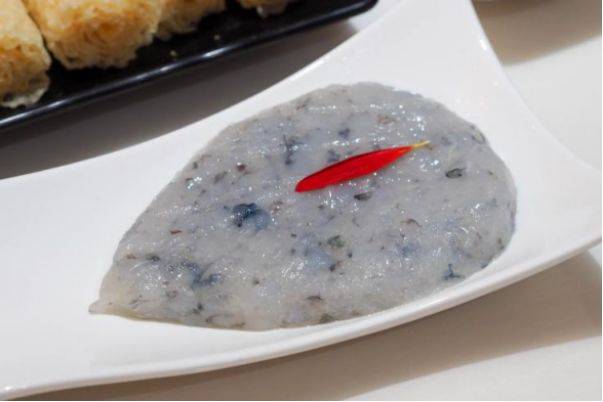另一个必点的菜品,是他们家的虾滑。别人家的虾滑都是用一个个小竹筒乘装的,而这里的虾滑是做成美美的叶子形状装在盘中,你仔细观察盘中的虾滑,还能很清楚的看到虾肉纤维。