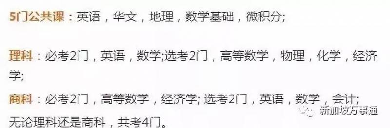 新加坡A水准考试跟中国高考的科目大不相同,A水准考试英文理解与写作(General Paper)、母语(中文或英文)、数学。另外3科可以从以下两组选择:部分理科方向:物理、化学、生物、会计。部分商科方向:经济、商业管理、历史、地理、艺术。