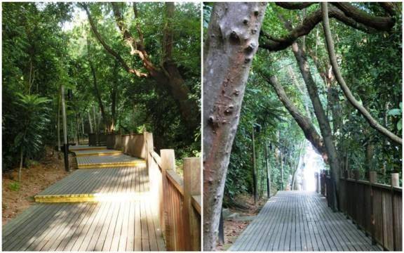 在MacRitchie Reservoir 有两条路可以徒步的,每个大约1小时。其中一个是离停车场不远,从水库最西端开始大约是1.5km的一条小道,这个地方有树有水,全段木板路,非常适合家庭式的轻松徒步,步道可以看到蜻蜓小动物以及各种各样的植物,也是一堂生动有趣的生物课!