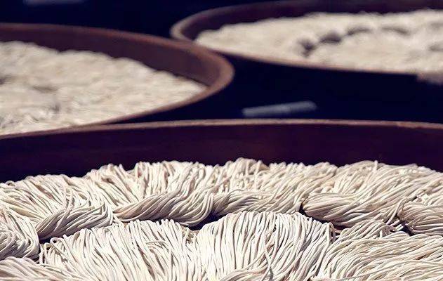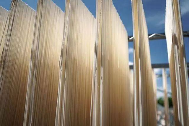 面条需经过两天的时间晒干。手工折成扇形后,面条被放在镂空竹筛上,每两小时要翻面一次,让面线都能均匀受热。所以面条口感有嚼劲,就算煮久了也不会烂。