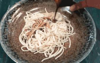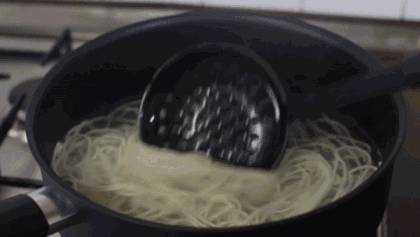 用漏勺把面捞出来,尽量保持面条干、少水分。