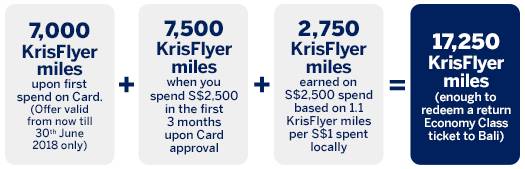 第一次用这张卡消费,累积7000里数;首3个月内再消费满S$2500,累积7500里数,然后再消费S$2500,累积2750里数,就足够兑换一张来回巴厘岛的机票哦!
