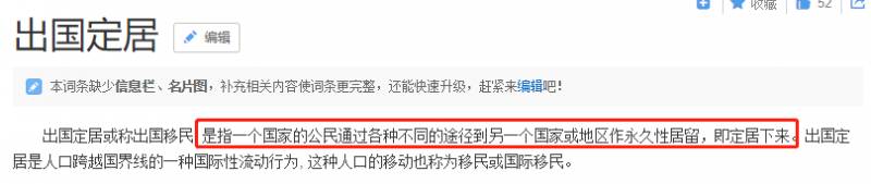此外,百度百科上,对于“出国定居”给出的解释是: