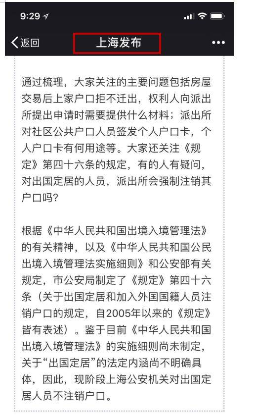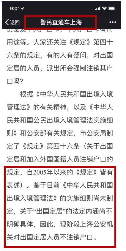 “根据《中华人民共和国出境入境管理法》的有关精神以及《中华人民共和国公民出境入境管理法实施细则》和公安部有关规定市公安局制定了《规定》第四十六条(关于出国定居和加入外国国籍人员注销户口的规定,自2005年以来的《规定》皆有表述)鉴于目前《中华人民共和国出境入境管理法》的实施细则尚未制定,关于“出国定居”的法定内涵尚不明确具体,因此,现阶段上海公安机关对出国定居人员不注销户口。”