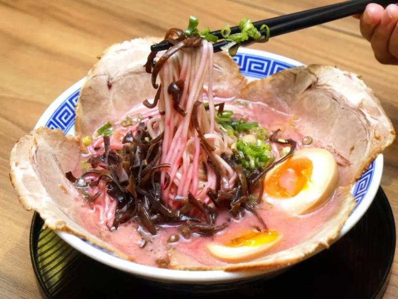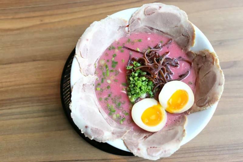 粉红色的汤底是加了红菜头和蓝莓熬制而成