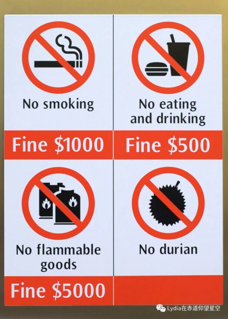 地铁公交上吃喝罚$500,抽烟罚$1000,携带易燃易爆物品罚$5000,不允许带榴梿!