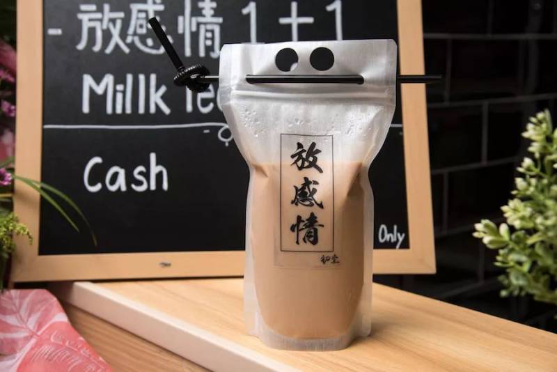 最吸引眼球的应该是这一袋写着“放感情”的袋装奶茶。可以直接提在手上,里面没有冰块,奶茶不会越喝越淡。