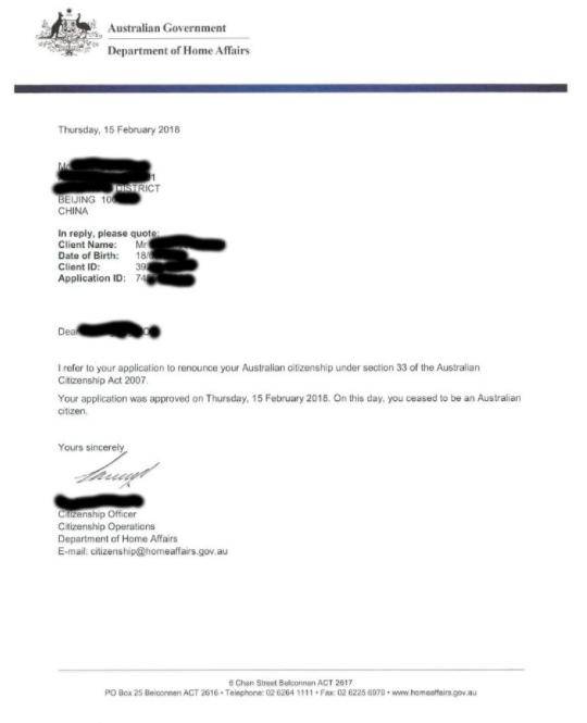 假设你的外国籍是A国籍,你就联系A国移民局或相关政府部门办理退国籍手续。到移民局或相关政府部门网站调研如何退国籍,把材料(含复籍证书的翻译公证)寄去,等待退籍证明。以澳洲为例,移民局收到材料后,几天之内就会发来电子邮件,给一个ref no,凭此ref no可在移民局网站跟踪进度。 再过两周左右会收到第二封电子邮件,要求把澳洲护照及公民证书原件寄给他们。他们收到护照及公民证书原件后会立即批准,并发电子邮件通知。本人已收到澳洲移民局的电子邮件,说退籍申请已批准,退籍证明(见图3)用挂号信寄给我。