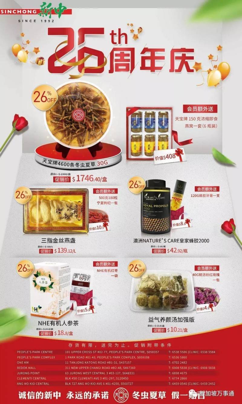 新中医药保健26周年庆钜惠!优惠商品都有26%的折扣!还可以直接在店里邮寄回中国哦~