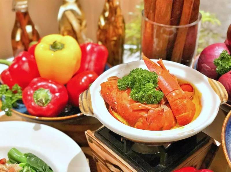 在Parkroyal on Beach Road里的自助餐餐厅Ginger,螃蟹和龙虾就是他们的招牌。其中南瓜龙虾煲是餐厅大厨Low Hoe Kiat的意外之作,而且意外的好吃,雪白龙虾肉沾上鲜甜浓稠的南瓜汁,成为了这里的招牌。