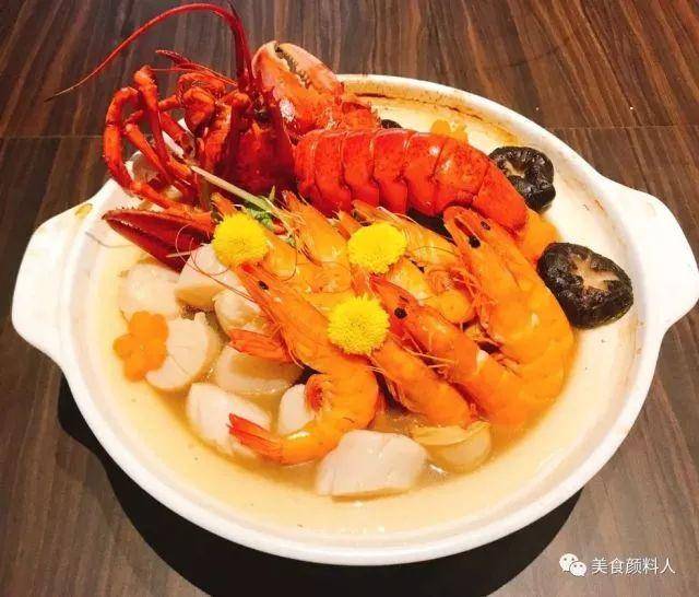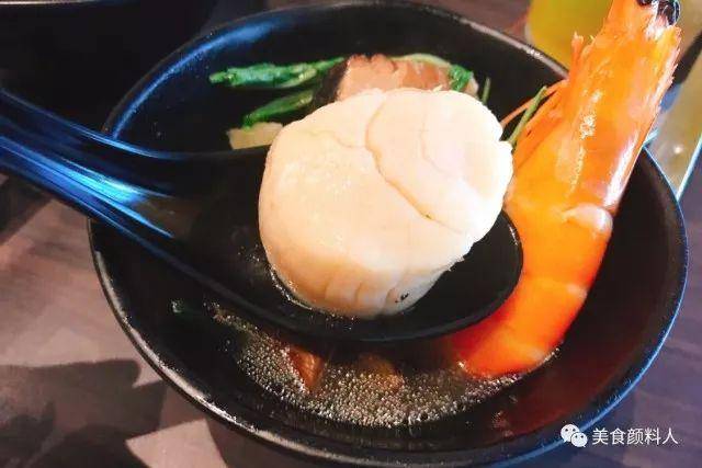 看汤底的配料:顶级北海道大干贝,波士顿龙虾,新鲜大海虾,极品香菇,鲍鱼,海参,烧五花肉,这些顶级配料一起熬制的汤底,集合了所有的精华,喝起来柔和滋润鲜美。