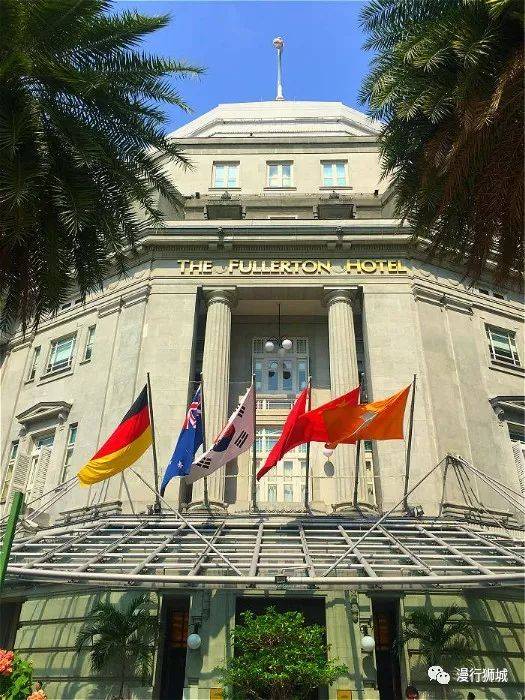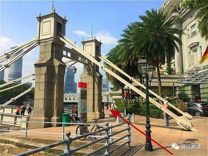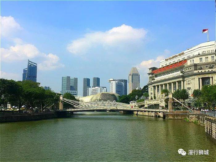 桥头旁边的西式建筑,是五星级的富丽敦酒店,建于1928年。原为邮政总局和本地商会的办公处,原名浮尔顿大厦(Fullerton Building),后来的70年里,大厦辗转成了多个政府部门的办公室,并被视为新加坡的地标之一。