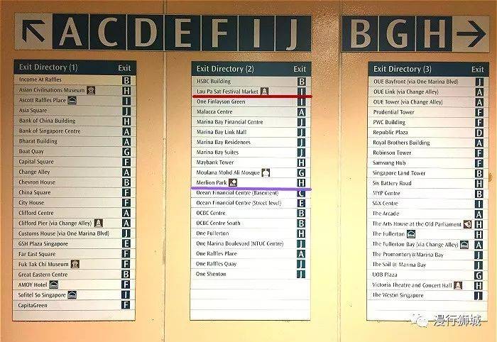 出口对面的墙上就有各个出口的方向以及出口周边的地标建筑,中间紫色线划出来的H口就是去鱼尾狮公园的方向,转右往H口方向出发!