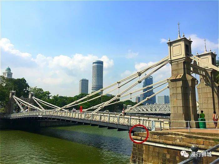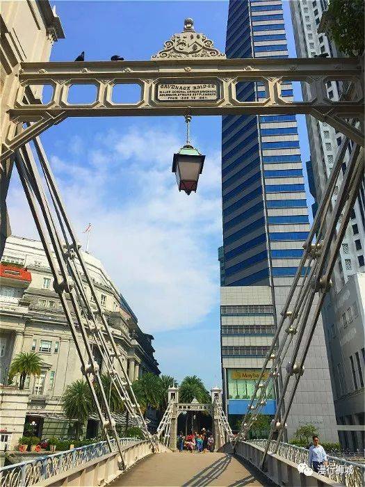 旁边的河上架著一条独特的桥:加文纳桥。加文纳桥(Cavenage Bridge)是新加坡唯一的悬索桥,建于1869年,有近150年的历史了,它以海峡殖民地总督最后一位总督加文纳的名字来命名,是新加坡现存最古老的桥。
