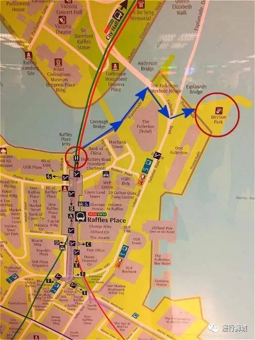 下图标注了如何从莱佛士地铁站H口出来,沿着新加坡河边走到鱼尾狮公园的。(小红圈是H出口,大红圈是鱼尾狮公园,蓝色箭头是行进方向。)