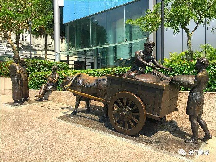 前面不远的地方,路边有一组塑像,描绘了以前在新加坡河口蓬勃贸易的情景。我们现在所处的位置是新加坡殖民时期的第一个码头:泊船码头。那时候的贸易往来主要是在这里实现的,是新加坡经济发展的起源地。早期的商品以丝绸,棉花,香料为主,到了19世纪末,交易的商品则多为橡胶、锡与椰干。