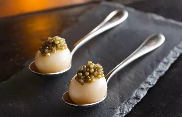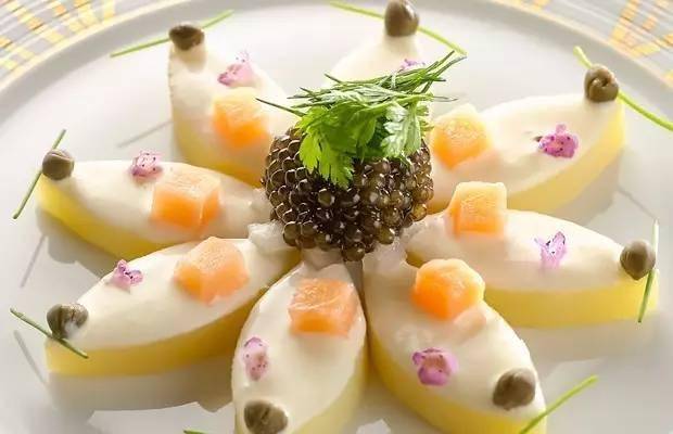 上图这道是鱼子酱薯仔沙拉:花瓣状的土豆围绕在鱼子酱周围,加以花瓣、熏鲑鱼和新鲜香草点缀。其他优质菜品还有:冷天使意面配海带、鱼子酱和黑松露;法国鲈鱼加阿莫里凯酱汁;香煎鹅肝和法国鳗鱼配柑橘果盘和鱼汤。