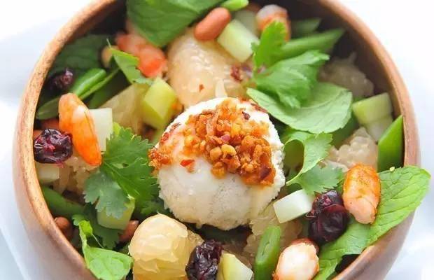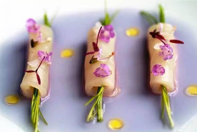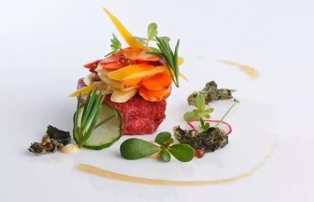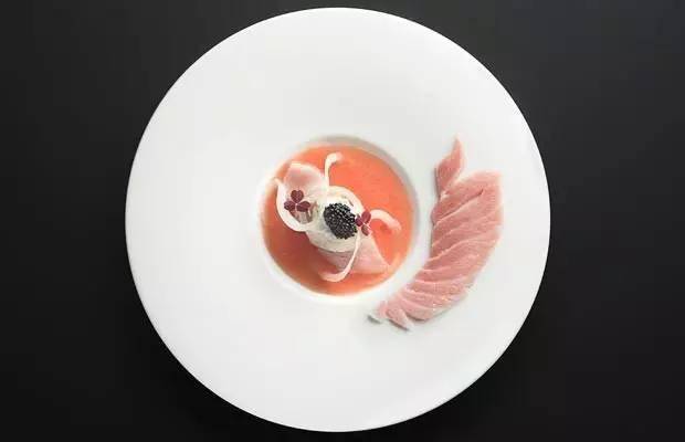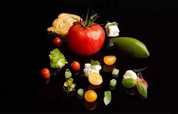 上图这道菜你看出什么门道没?全是大大小小、不同颜色的番茄哦~平凡的番茄一经“挖掘”也神奇变身了。中间那个较大的是天然番茄,用低温烹饪法在番茄汤中烹煮以增强味道,内填馅料是番茄、黄瓜,酸豆和牛至。