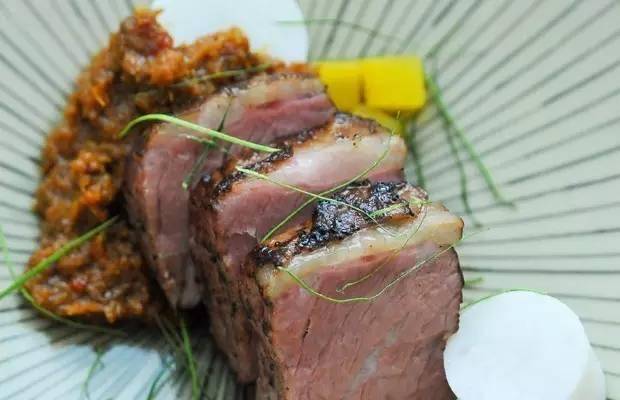 餐厅菜品的本来面目都是新加坡小贩和熟食中心的食物,经过一番“修饰”变身颇有新加坡风格的精致料理。上图这道是仁当咖喱牛仔骨配泰国青柠。仁当咖喱是马来菜中的精髓,用牛肉加椰奶、香料,小火慢炖。如此说来,这里的食物会让人感觉很亲切哦~