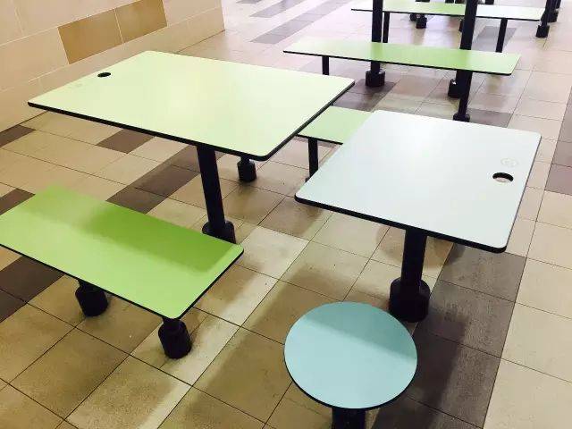 浅绿和深绿色搭配的桌椅,整齐排放,小清新范儿十足。