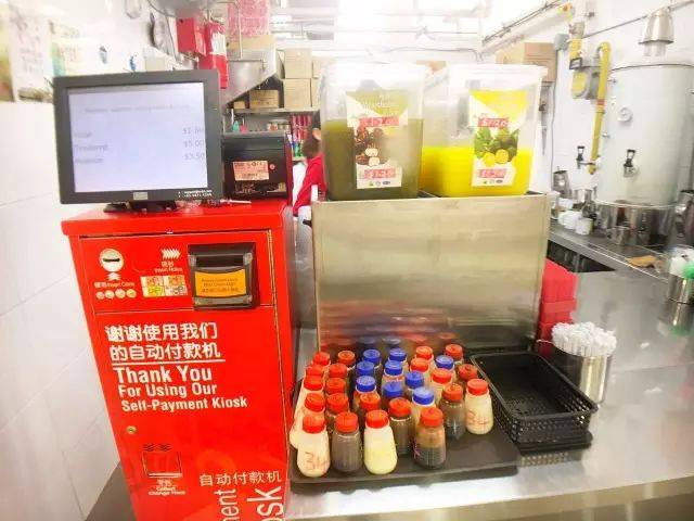每个摊位前都配有一台醒目的红色自动付款机,让客户自助支付,这不仅解决了卫生问题,削减了人力,更解放了摊主,他们只须专心负责做食物,就Ok了。