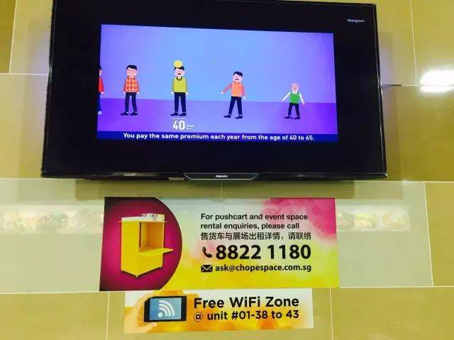 1)就是前面请大家注意的那个大屏幕,每个走道甚至个别摊位旁,循环滚动播出小贩中心的美食信息、公益以及政府出台的新政策等等。哇哦~排队再不会像以前那样无聊了。