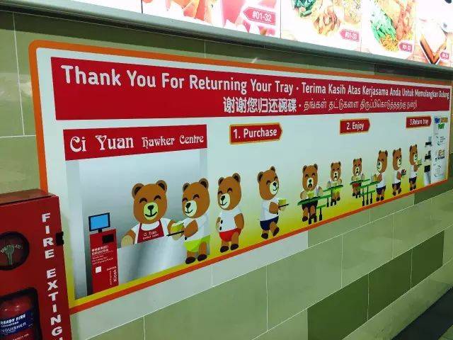 茨园小贩中心的“归还碗碟托盘”海报,是我见过最生动有趣的,没有之一!看见那么俏皮的“壁画”,不要说是小孩,大人都忍不住要主动返还餐具。