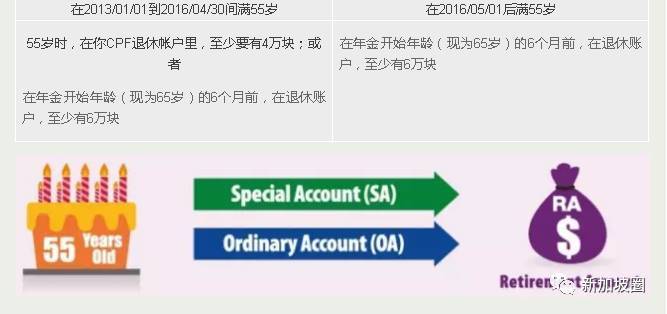 需要强调——CPF规定所有公民以及永久居民于55周岁时需要保留148000新币的最低余额(minimum sum),该最低余额将来自特别户头以及普通户头,统一存入退休户头(Retirement Account)。