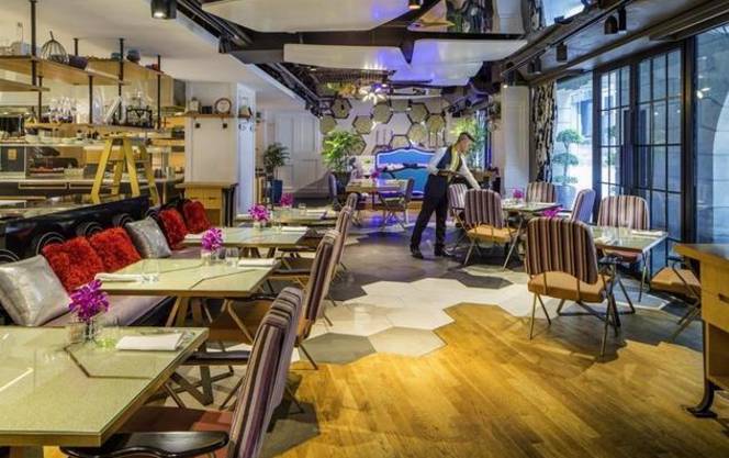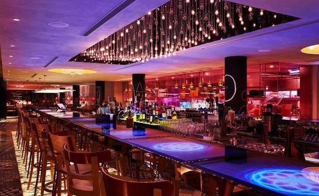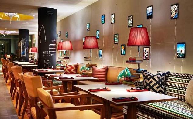 M Social 以年轻人为目标,酒店大堂设自动登记付账机器,亮点是酒店的酒吧餐厅 “Beast & Butterflies”,墙上由平板电脑和书籍参差装点,长酒吧的桌面更是一面长方形的电视屏幕,整体都对上这个族群的喜好与作风。