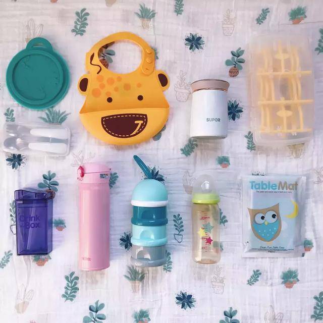 餐具类:折叠碗、围兜、焖烧杯、便携奶瓶晾晒架、叉勺、水杯、保温杯、奶粉盒、奶瓶、一次性桌垫