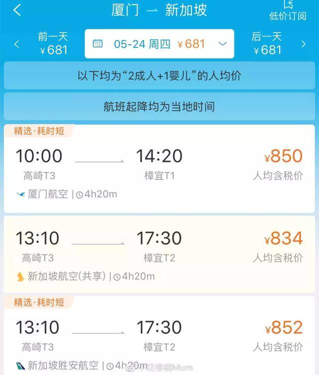 2、例如:搜索 5月24日 厦门至新加坡 2成人1婴儿 出来的价格就是人均834元,三个人就是2500,但如果是1成人的价格就要相对比套票的价格高。这是订亲子机票的小窍门,仅限于三人且不是所有日期都可以,所以要查看好出行日期再安排。