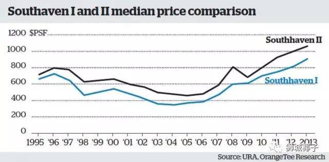 这两个项目的价格差距,从1995年推出时的8%扩大至2013年的18%。如果只是依据这两个项目的价格走势就无法下定论,因为其成交量少且不均匀,在2003年,Southhaven I仅成交五间,Southhaven II仅成交一间,而且同年成交的单位的楼层或方向都不同。