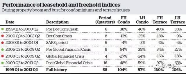 在2004年中至2008年中的上涨期,永久地契公寓的价格暴涨了64.7%,而99年地契公寓价格只上升了50.6%。到了2008年中至2009年中的衰退期,永久地契公寓下跌了26.5%,但99年地契公寓价格只下跌了23.8%。
