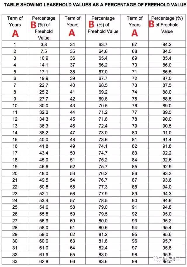 以下表格是99年地契和永久地契房产的价值比较,栏目A是99年地契的剩余地契年限,栏目B是相当于永久地契价值的百分比,例如99年地契的房产,剩下只有34年的地契时,其价值相当于永久地契的63.7%。