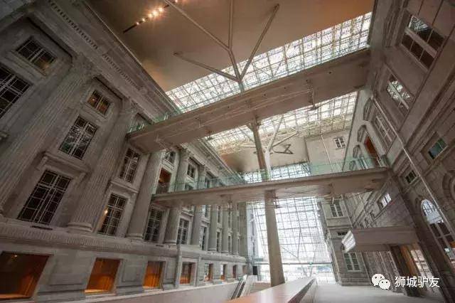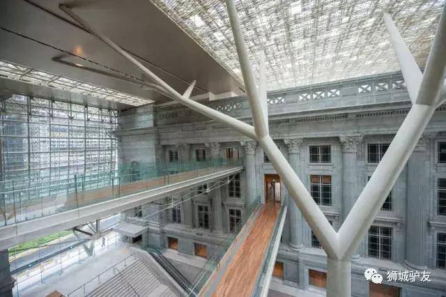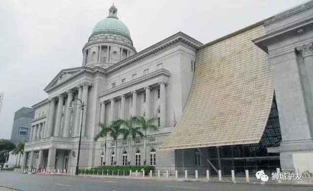 新加坡国家美术馆所在建筑的前身是旧时的国会大厦与最高法庭。两座建筑被巧妙地连接在一起,连接处由铝合金的叶片状材料铺满,由树状支柱撑起,阳光透过缝隙洒下,仿若漫步雨林之中。
