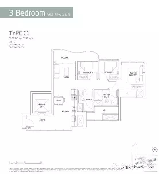 三卧室,套内面积75平方米(807平方尺)至98平方米(1,055平方尺)。这个户型的共同特点是,客厅和普通房共享大小适宜的弧形阳台,而有些户型在主人房也有阳台。三卧室有C1至C8共8个户型供选择,其中的C1和C8户型配有私人电梯。三居室户型最低售价从S$1,515,000元起。