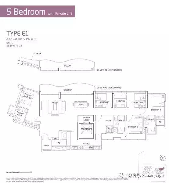 五卧室,套内面积186平方米(2,002平方尺)。五卧室户型除了具有所有四卧室的优点外,另外一个特点是主人房与所有其它房间分开,并与私人电梯较远,主人可以在相对独立、安静的环境下休息。这个户型的整套售价从S$3,123,000元起。
