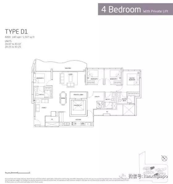 四卧室,套内面积140平方米(1,507平方尺)。和其它房型一样,四卧室户型的每个房间都是方方正正,客厅宽敞,并配备一个宽大的弧形阳台。还有一个特点是厨房和餐厅以及客厅完全分开,并且还有一个家庭房(family room)。另外,所有的四卧室均配备私人电梯。这个户型的整套售价从S$2,364,000元起。