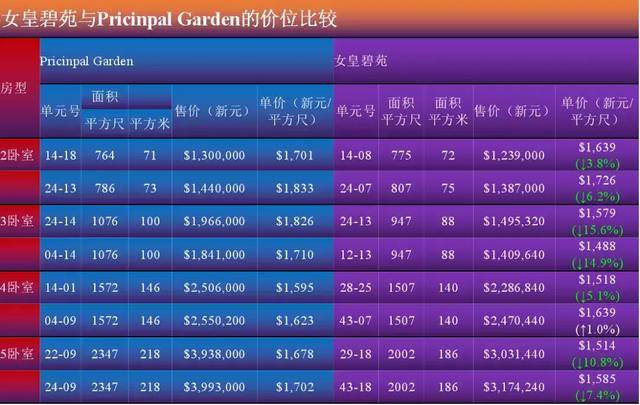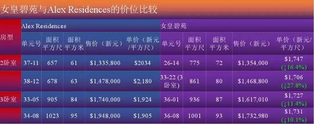 女皇碧苑与邻近的联邦大厦(Commonwealth Towers)有相当的可比性,它们都是还未竣工的99年地契公寓,与女皇镇地铁站均很近,有相近的地理位置。根据现有的成交价,我们比较了两卧室,三卧室和四卧室的总体价格的平均单价。总体而言,女皇碧苑的售价比联邦大厦低5-15%。我们再来比较一下位于同一邮区的另外一栋正在建造的新公寓Principal Garden。我们比较了位于同一楼层的2卧室、3卧室、4卧室和5卧室单元。总体而言,女皇碧苑的单价比Principal Garden公寓低3.8-15.6%。最后我们比较了位于红山地铁站旁的Alex Residences。我们比较了2卧室和3卧室位于同一楼层的单元,我们发现,女皇碧苑的单价比Alex Residences公寓低10.1-27.8%。所有的这些数据显示,女皇碧苑还有升值的空间,值得购买。