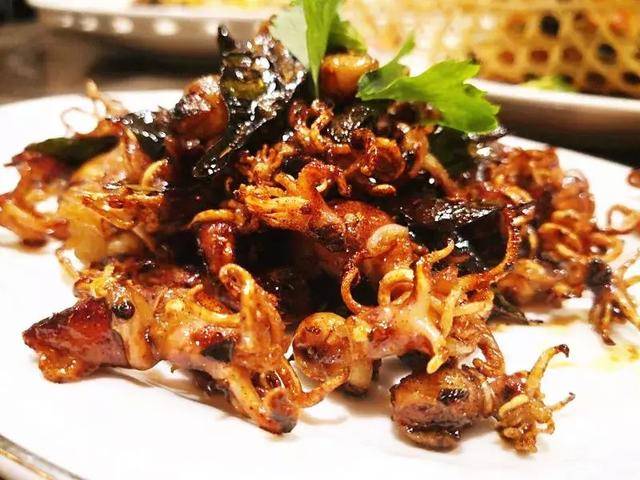 用咖喱叶煎出来的鱿鱼仔,带着满满的南洋风味。这道香煎鱿鱼仔结合新加坡特色想出来的点子。