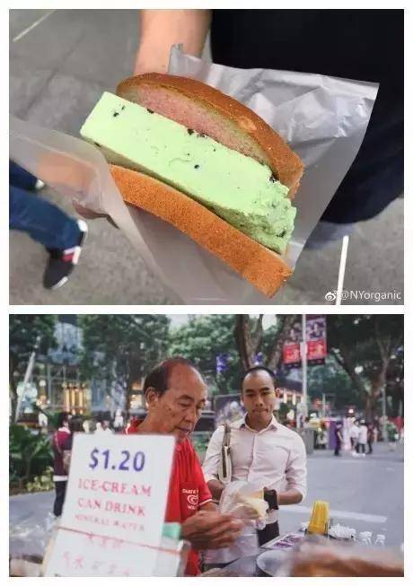 在乌节路上其实有不少类似那个老大爷(新加坡都叫安哥uncle)卖冰淇淋的,冰淇淋切厚厚一片,夹在彩色的吐司面包片里。