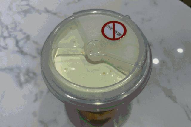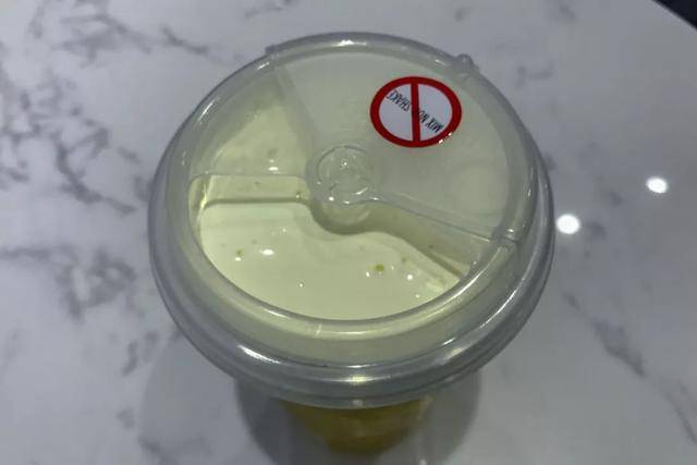 盖子居然用了普通的奶茶盖子,这样喝奶盖极其的不方便。君君要打开盖子废了老大的劲。打开发现了奶盖边上都是一串串的小气泡。