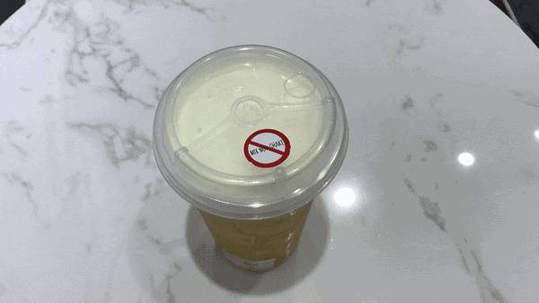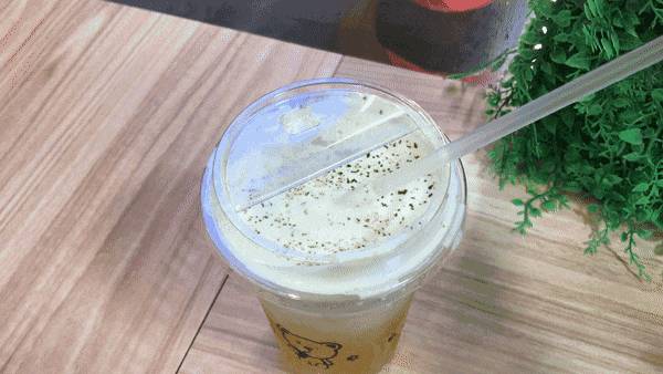 这里的奶盖差不多3-4厘米,茉莉绿茶呈金黄色,盖子用的也是标准的掀盖设计。