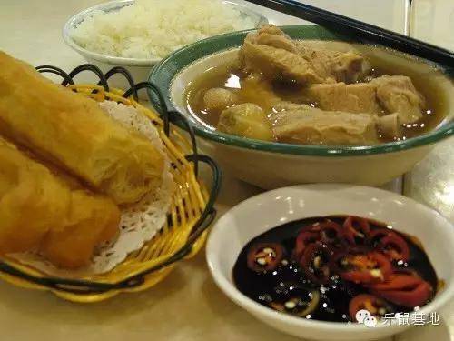 这道美食用排骨、香料(肉桂、茴香、丁香、八角等)加上药材文火煨制而成,汤呈现深色,药香浓郁,吃的时候可以搭配米饭、油条和辣椒黑酱油,吃完肉骨茶,通常还会喝一小盅潮州的功夫普洱茶,滋味浓醇,馨香入肺,据说常吃有强身健体的功效。