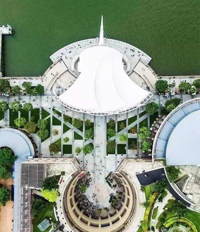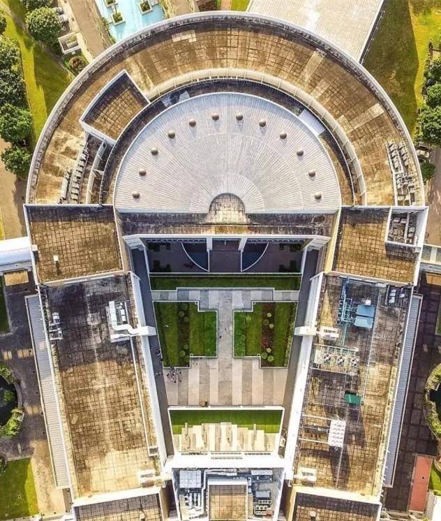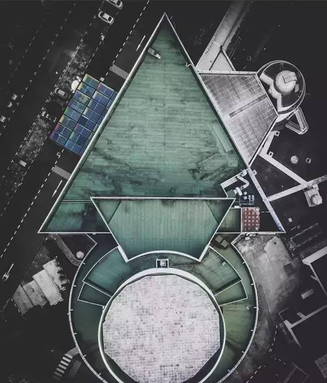 天空视角:四周绿意盎然,菱形的建筑,水滴状的建筑草坪,很有艺术感~