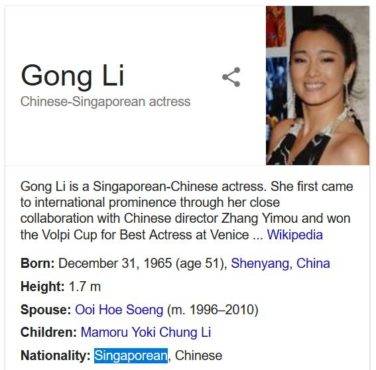 被誉为“女皇”的国际巨星巩俐早在2008年就加入了新加坡国籍,领取了新加坡居民证书及粉红色身份证,并正式宣誓成为狮城公民。