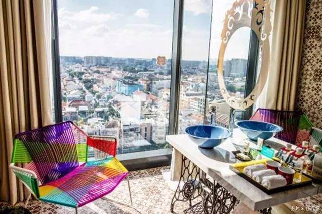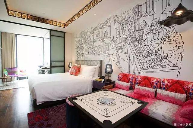 在这里,洗手盘的支撑是旧时的针车,墙纸是手绘新加坡街景。而且酒店距离机场不超过10分钟,附近有很多好吃。所以啊,感受峇峇娘惹的点滴生活,就住这里吧!