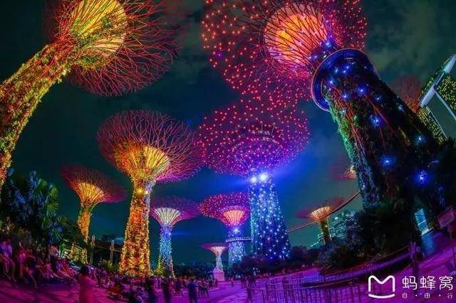 在每天晚上7:45和8:45,都会各有一场声光汇演。表演是用灯光音乐效果呈现的,人们在擎天树下就地躺下来,一同欣赏缤纷绚丽的夜景。