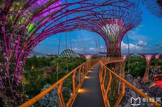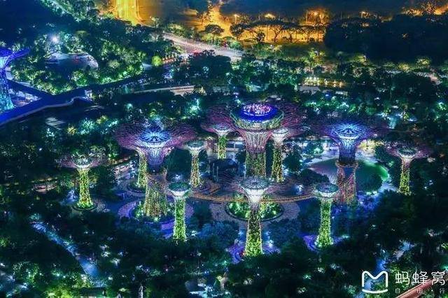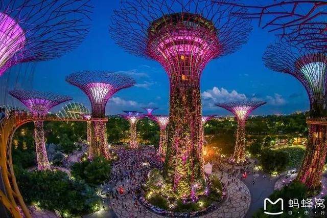 在夜幕降临时来到滨海湾花园,来到这里远远就看见高高的擎天大树,有点像阿凡达里面的场景。可以登上连接着擎天大树的华侨银行空中走道,滨海湾花园的夜景尽收眼底。