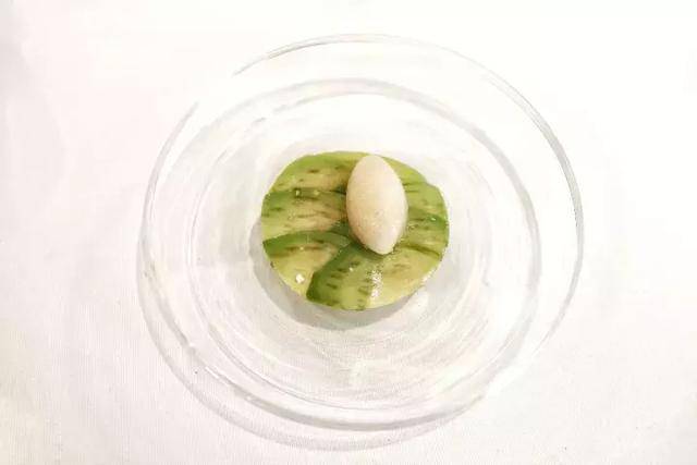酸葡萄汁雪葩(Verjus Sorbet)铺着的牛油果,这个造型让我想到了祥云。盖着南瓜子和冻苹果干,口感真神奇。